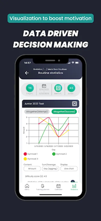 With GymTrack World, you can create personalized training plans that cater specifically to the demands of gymnastics. These plans allow you to track your progress, evaluate each attempt at learning or practicing an element, routine, or exercise, and gain valuable insights into your performance. By providing comprehensive statistics, the app enables you to analyze your daily progress, identify areas for improvement, and ultimately enhance your skills.