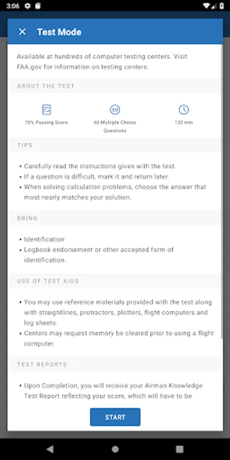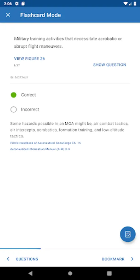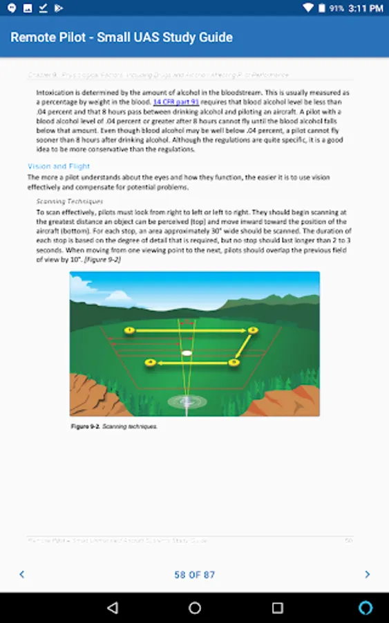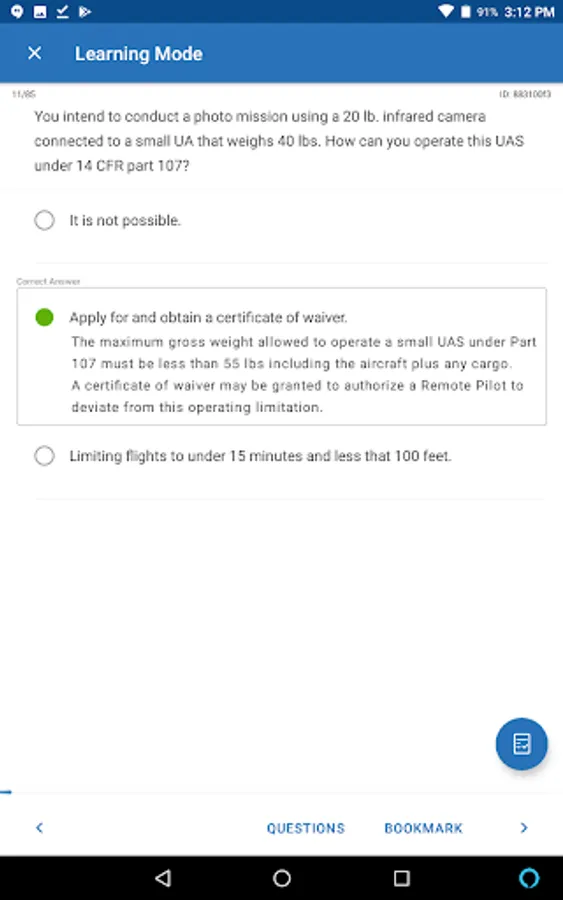 Test mode randomly generates a 60-question session from the entire database of published FAA test questions, simulating the real Remote Pilot test. After answering all the questions, you’ll be given instant results, and have the option to review either all the questions, or just missed questions. Included in the review session are the same detailed explanations for why each answer is correct.