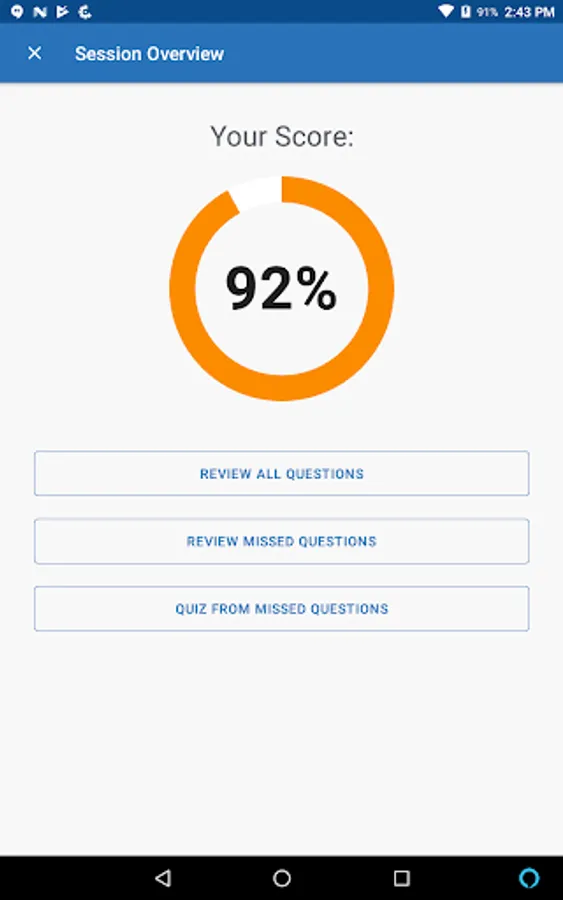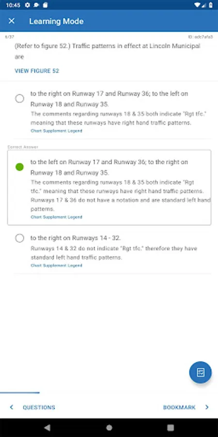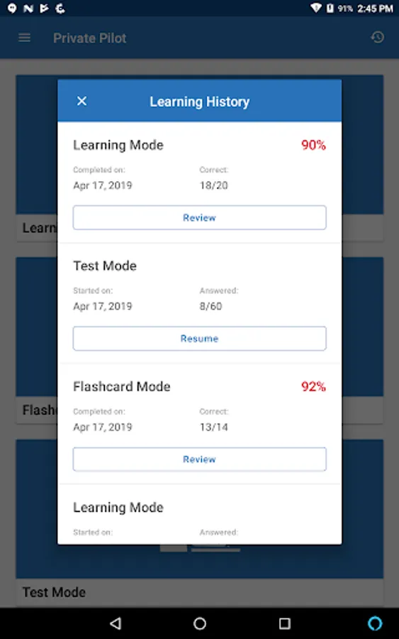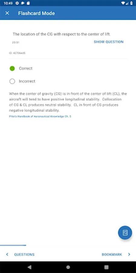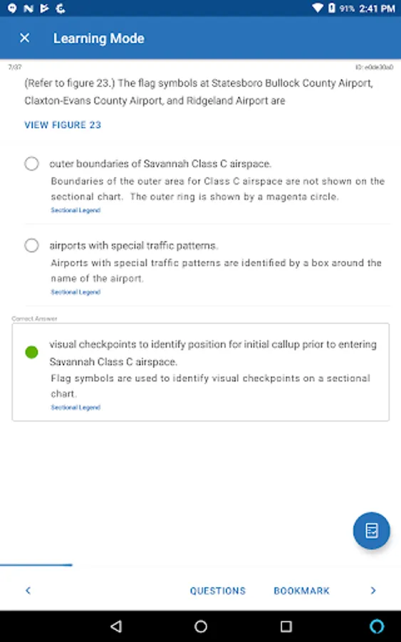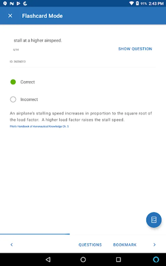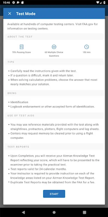 Test mode randomly generates a 60-question session from the entire database of published FAA test questions, simulating the real Private Pilot test. After answering all the questions, you’ll be given instant results, and have the option to review either all the questions, or just missed questions. Included in the review session are the same detailed explanations for why each answer is right or wrong.