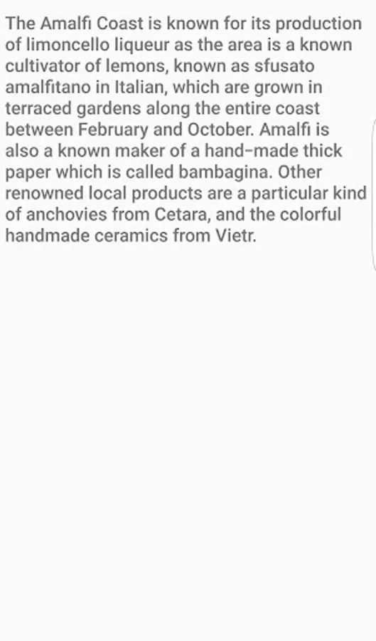 The Amalfi Coast is known for its production of limoncello liqueur as the area is a known cultivator of lemons, known as sfusato amalfitano in Italian, which are grown in terraced gardens along the entire coast between February and October.[7] Amalfi is also a known maker of a hand-made thick paper which is called bambagina.[8] Other renowned local products are a particular kind of anchovies (local Italian: alici) from Cetara, and the colorful handmade ceramics from Vietri.[citation needed]