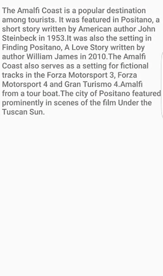 The Amalfi Coast is a popular destination among tourists. It was featured in Positano, a short story written by American author John Steinbeck in 1953.[10] It was also the setting in "Finding Positano, A Love Story" written by author William James in 2010.