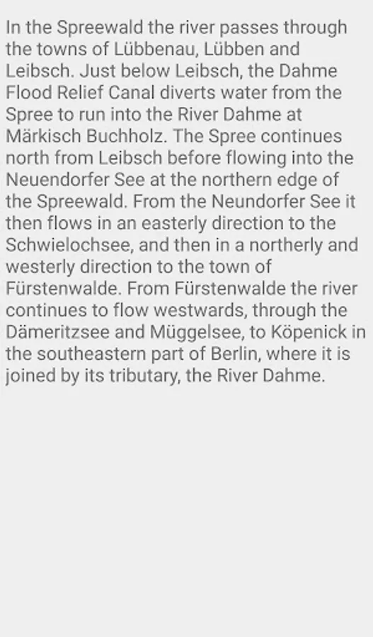 In the Spreewald the river passes through the towns of Lübbenau, Lübben and Leibsch. Just below Leibsch, the Dahme Flood Relief Canal diverts water from the Spree to run into the River Dahme at Märkisch Buchholz. The Spree continues north from Leibsch before flowing into the Neuendorfer See at the northern edge of the Spreewald. From the Neundorfer See it then flows in an easterly direction to the Schwielochsee, and then in a northerly and westerly direction to the town of Fürstenwalde. From Fürstenwalde the river continues to flow westwards, through the Dämeritzsee and Müggelsee, to Köpenick in the southeastern part of Berlin, where it is joined by its tributary, the River Dahme.
