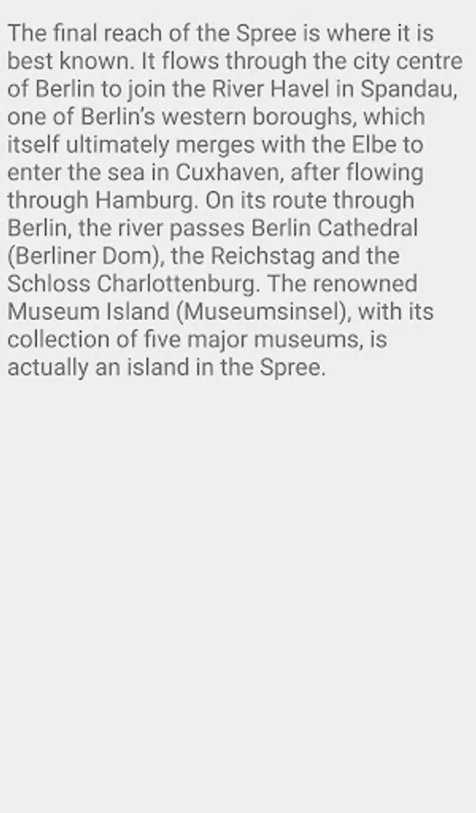 The final reach of the Spree is where it is best known. It flows through the city centre of Berlin to join the River Havel in Spandau, one of Berlin’s western boroughs, which itself ultimately merges with the Elbe to enter the sea in Cuxhaven, after flowing through Hamburg. On its route through Berlin, the river passes Berlin Cathedral (Berliner Dom), the Reichstag and the Schloss Charlottenburg. The renowned Museum Island (Museumsinsel), with its collection of five major museums, is actually an island in the Spree.
