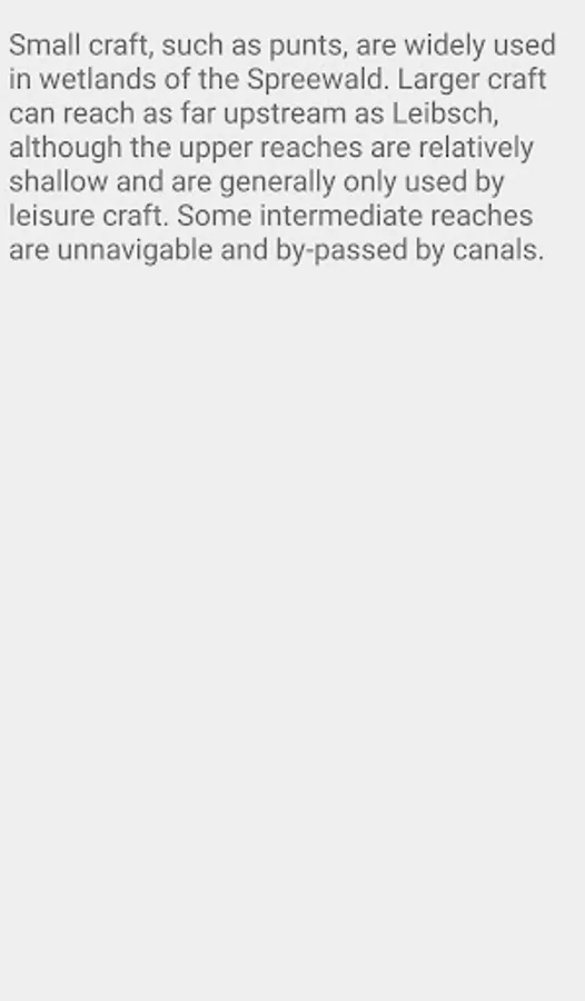 Small craft, such as punts, are widely used in wetlands of the Spreewald. Larger craft can reach as far upstream as Leibsch, although the upper reaches are relatively shallow and are generally only used by leisure craft. Some intermediate reaches are unnavigable and by-passed by canals.