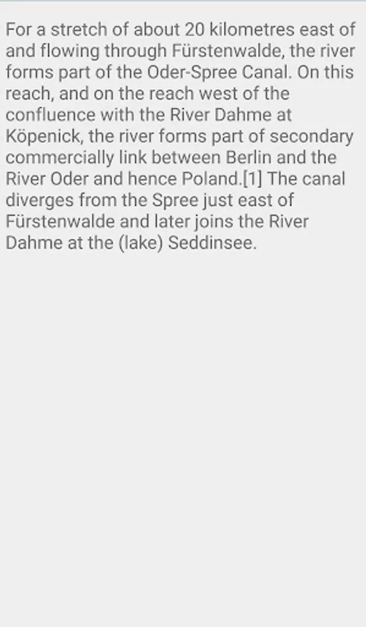 For a stretch of about 20 kilometres (12 mi) east of and flowing through Fürstenwalde, the river forms part of the Oder-Spree Canal. On this reach, and on the reach west of the confluence with the River Dahme at Köpenick, the river forms part of secondary commercially link between Berlin and the River Oder and hence Poland. The canal diverges from the Spree just east of Fürstenwalde and later joins the River Dahme at the (lake) Seddinsee.
