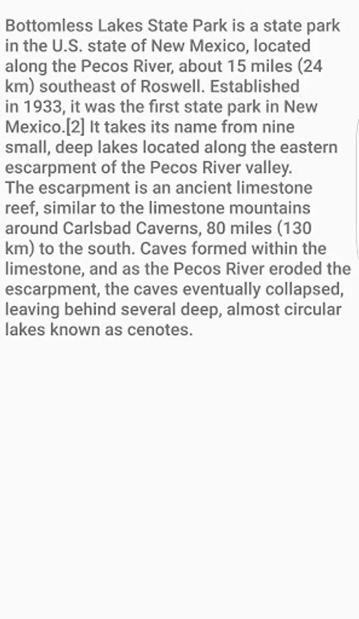 Bottomless Lakes State Park is a state park in the U.S. state of New Mexico, located along the Pecos River, about 15 miles (24 km) southeast of Roswell. Established in 1933, it was the first state park in New Mexico.[2] It takes its name from nine small, deep lakes located along the eastern escarpment of the Pecos River valley. The escarpment is an ancient limestone reef, similar to the limestone mountains around Carlsbad Caverns, 80 miles (130 km) to the south. Caves formed within the limestone, and as the Pecos River eroded the escarpment, the caves eventually collapsed, leaving behind several deep, almost circular lakes known as