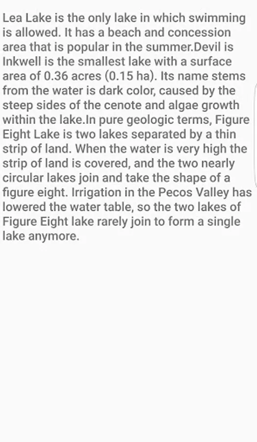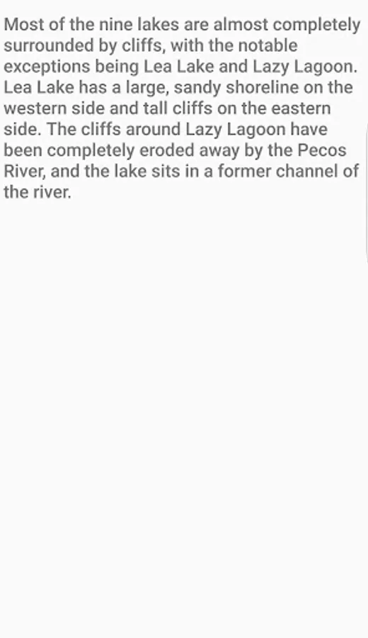 Most of the nine lakes are almost completely surrounded by cliffs, with the notable exceptions being Lea Lake and Lazy Lagoon. Lea Lake has a large, sandy shoreline on the western side and tall cliffs on the eastern side. The cliffs around Lazy Lagoon have been completely eroded away by the Pecos River, and the lake sits in a former channel of the river.