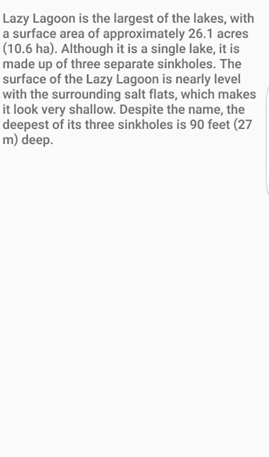Lazy Lagoon is the largest of the lakes, with a surface area of approximately 26.1 acres (10.6 ha). Although it is a single lake, it is made up of three separate sinkholes. The surface of the Lazy Lagoon is nearly level with the surrounding salt flats, which makes it look very shallow. Despite the name, the deepest of its three sinkholes is 90 feet (27 m) deep.[3][4]