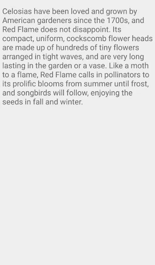 Celosias have been loved and grown by American gardeners since the 1700s, and 'Red Flame' doesn't disappoint. Its compact, uniform, "cockscomb" flower heads are made up of hundreds of tiny flowers arranged in tight waves, and are very long lasting in the garden or a vase. Like a moth to a flame, 'Red Flame' calls in pollinators to its prolific blooms from summer until frost, and songbirds will follow, enjoying the seeds in fall and winter.