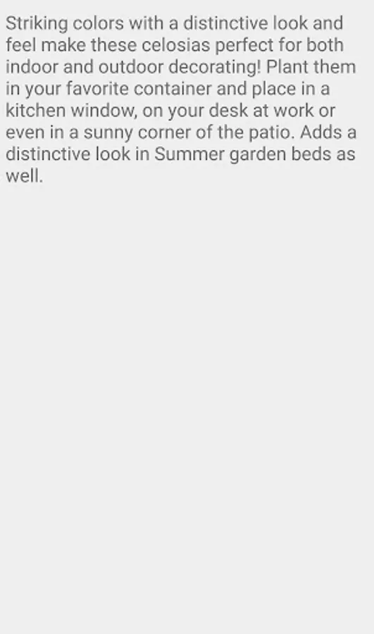 Celosia flowers, with their unusual blooms, can "flower" up to 10 weeks. When many of these "flowers" are next to each other, they collectively resemble fire, which is why the name Celosia, meaning burning in Greek, was chosen.