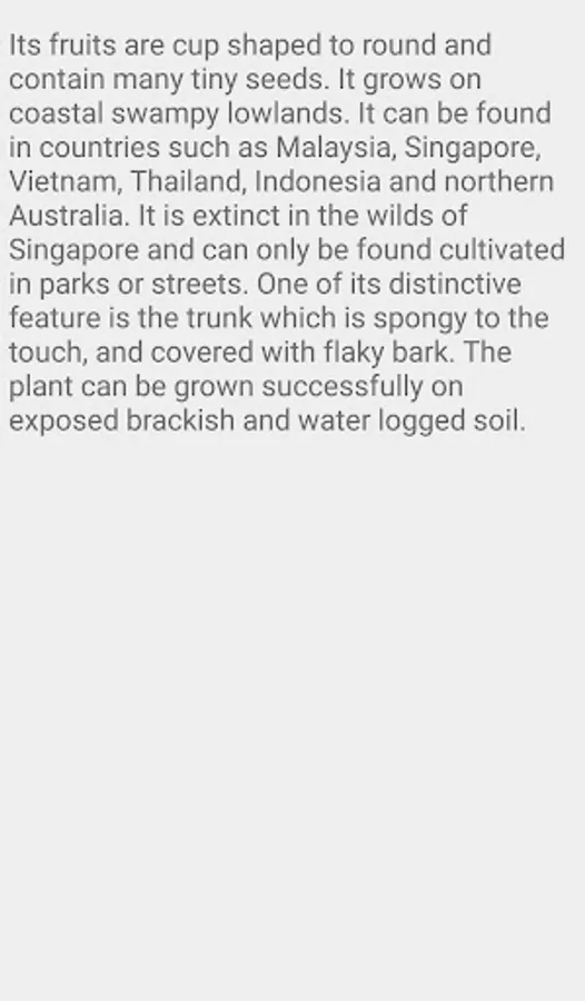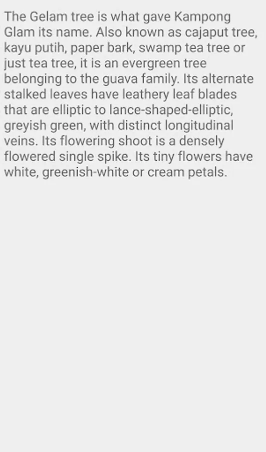 The Gelam tree is what gave Kampong Glam its name. Also known as cajaput tree, kayu putih, paper bark, swamp tea tree or just tea tree, it is an evergreen tree belonging to the guava family. Its alternate stalked leaves have leathery leaf blades that are elliptic to lance-shaped-elliptic, greyish green, with distinct longitudinal veins. Its flowering shoot is a densely flowered single spike. Its tiny flowers have white, greenish-white or cream petals. Its fruits are cup shaped to round and contain many tiny seeds. It grows on coastal swampy lowlands. It can be found in countries such as Malaysia, Singapore, Vietnam, Thailand, Indonesia and northern Australia. It is extinct in the wilds of Singapore and can only be found cultivated in parks or streets. One of its distinctive feature is the trunk which is spongy to the touch, and covered with flaky bark. The plant can be grown successfully on exposed brackish and water logged soil.