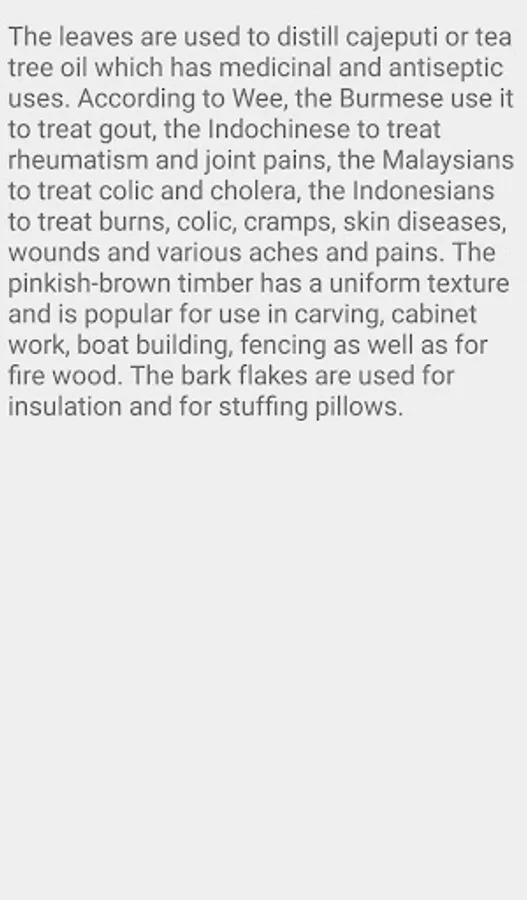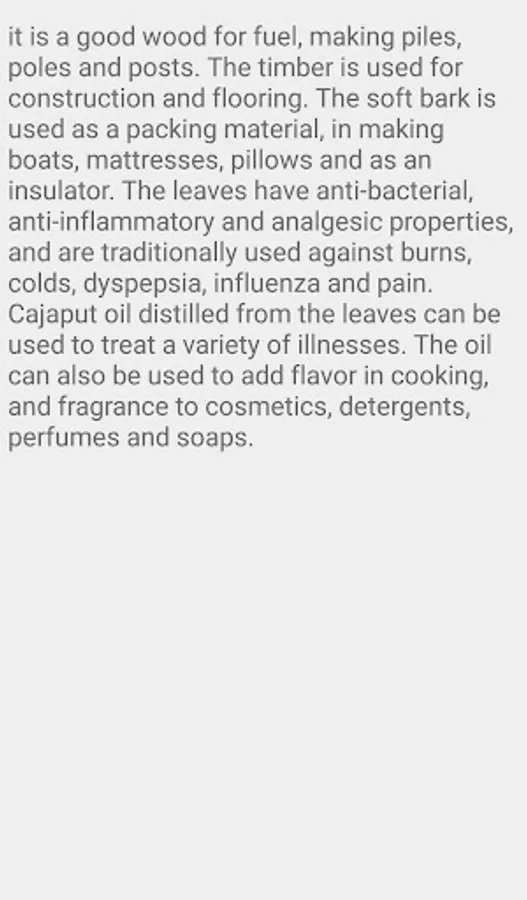 it is a good wood for fuel, making piles, poles and posts. The timber is used for construction and flooring. The soft bark is used as a packing material, in making boats, mattresses, pillows and as an insulator. The leaves have anti-bacterial, anti-inflammatory and analgesic properties, and are traditionally used against burns, colds, dyspepsia, influenza and pain. Cajaput oil distilled from the leaves can be used to treat a variety of illnesses. The oil can also be used to add flavor in cooking, and fragrance to cosmetics, detergents, perfumes and soaps.