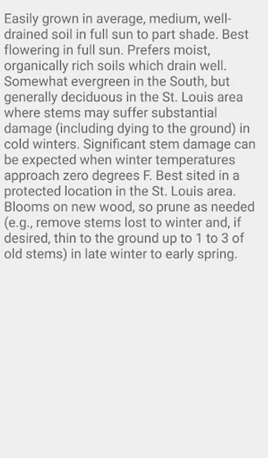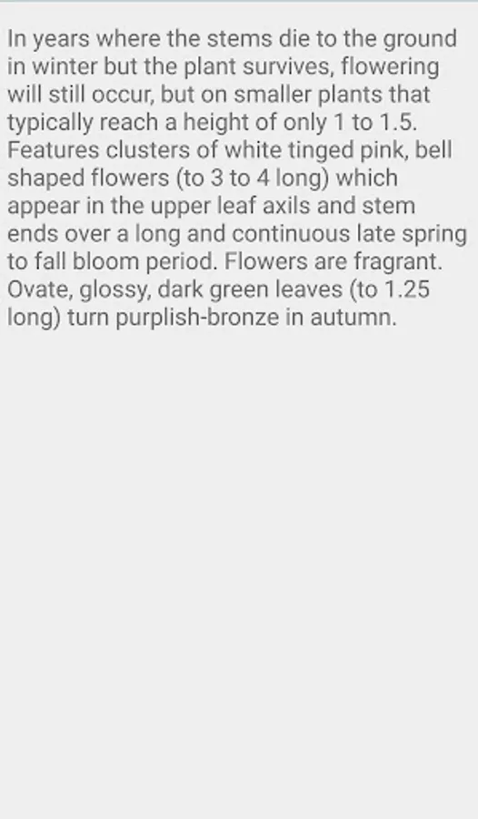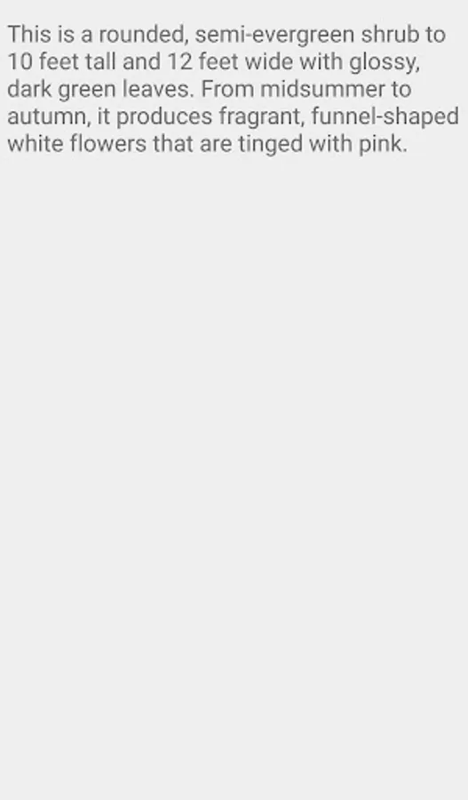 This is a rounded, semi-evergreen shrub to 10 feet tall and 12 feet wide with glossy, dark green leaves. From midsummer to autumn, it produces fragrant, funnel-shaped white flowers that are tinged with pink.