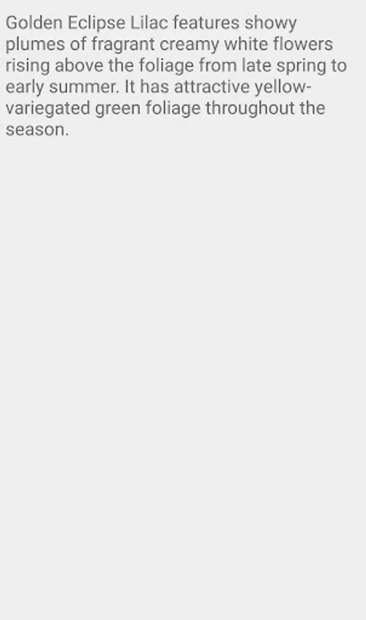 Golden Eclipse Lilac features showy plumes of fragrant creamy white flowers rising above the foliage from late spring to early summer. It has attractive yellow-variegated green foliage throughout the season. The pointy leaves are highly ornamental but do not develop any appreciable fall colour. The fruit is not ornamentally significant. The smooth dark red bark adds an interesting dimension to the landscape.