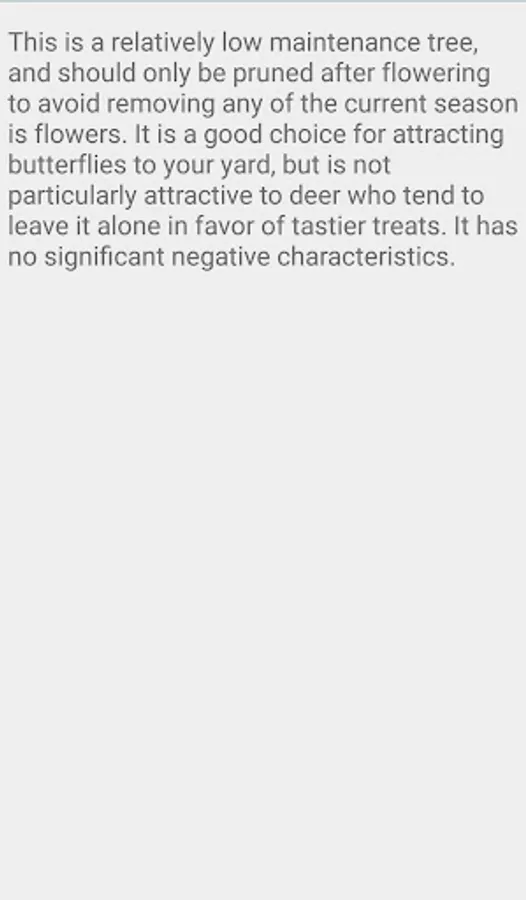 This is a relatively low maintenance tree, and should only be pruned after flowering to avoid removing any of the current season's flowers. It is a good choice for attracting butterflies to your yard, but is not particularly attractive to deer who tend to leave it alone in favor of tastier treats. It has no significant negative characteristics.
