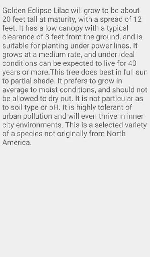 Golden Eclipse Lilac will grow to be about 20 feet tall at maturity, with a spread of 12 feet. It has a low canopy with a typical clearance of 3 feet from the ground, and is suitable for planting under power lines. It grows at a medium rate, and under ideal conditions can be expected to live for 40 years or more.