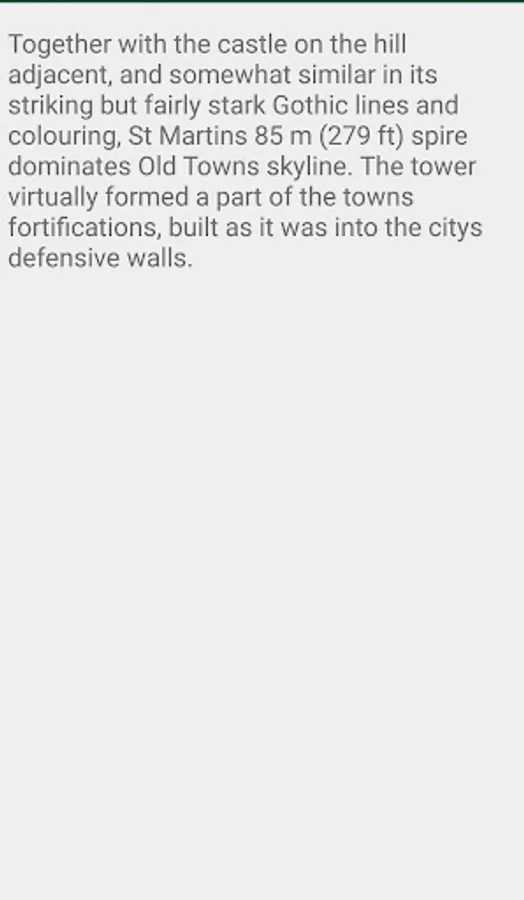 Together with the castle on the hill adjacent, and somewhat similar in its striking but fairly stark Gothic lines and colouring, St Martin's 85 m (279 ft) spire dominates Old Town's skyline. The tower virtually formed a part of the town's fortifications, built as it was into the city's defensive walls.
