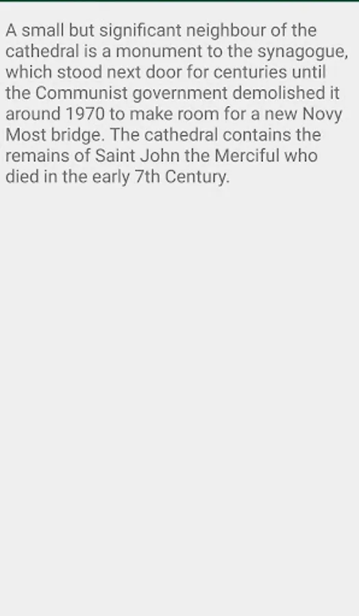 A small but significant neighbour of the cathedral is a monument to the synagogue, which stood next door for centuries until the Communist government demolished it around 1970 to make room for a new Nový Most bridge. The cathedral contains the remains of Saint John the Merciful who died in the early 7th Century.