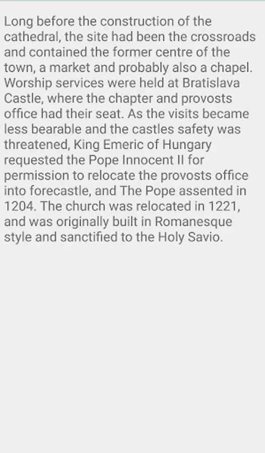Long before the construction of the cathedral, the site had been the crossroads and contained the former centre of the town, a market and probably also a chapel. Worship services were held at Bratislava Castle, where the chapter and provost's office had their seat. As the visits became less bearable and the castle's safety was threatened, King Emeric of Hungary requested the Pope Innocent II for permission to relocate the provost's office into forecastle, and The Pope assented in 1204. The church was relocated in 1221, and was originally built in Romanesque style and sanctified to the Holy Savior.