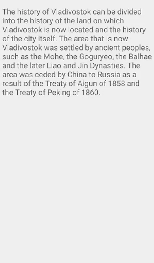 The history of Vladivostok can be divided into the history of the land on which Vladivostok is now located and the history of the city itself. The area that is now Vladivostok was settled by ancient peoples, such as the Mohe, the Goguryeo, the Balhaeand the later Liao and Jīn Dynasties. The area was ceded by China to Russia as a result of the Treaty of Aigun of 1858 and the Treaty of Peking of 1860.