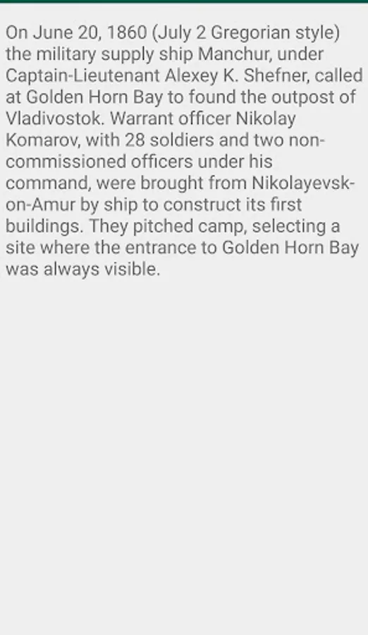 On June 20, 1860 (July 2 Gregorian style) the military supply ship Manchur, under Captain-Lieutenant Alexey K. Shefner, called at Golden Horn Bay to found the outpost of Vladivostok. Warrant officer Nikolay Komarov, with 28 soldiers and two non-commissioned officers under his command, were brought from Nikolayevsk-on-Amur by ship to construct its first buildings. They pitched camp, selecting a site where the entrance to Golden Horn Bay was always visible.