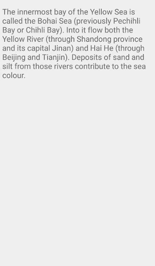 The innermost bay of the Yellow Sea is called the Bohai Sea (previously Pechihli Bay or Chihli Bay). Into it flow both the Yellow River (through Shandong province and its capital Jinan) and Hai He (through Beijing and Tianjin). Deposits of sand and silt from those rivers contribute to the sea colour.