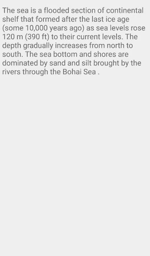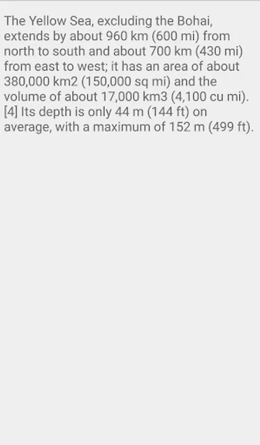 The Yellow Sea, excluding the Bohai, extends by about 960 km (600 mi) from north to south and about 700 km (430 mi) from east to west; it has an area of about 380,000 km2 (150,000 sq mi) and the volume of about 17,000 km3 (4,100 cu mi).[4] Its depth is only 44 m (144 ft) on average, with a maximum of 152 m (499 ft). The sea is a flooded section of continental shelf that formed after the last ice age (some 10,000 years ago) as sea levels rose 120 m (390 ft) to their current levels. The depth gradually increases from north to south. The sea bottom and shores are dominated by sand and silt brought by the rivers through the Bohai Sea (Liao River, Yellow River, Hai He) and the Korea Bay (Yalu River). Those deposits, together with sand storms are responsible for the yellow water color and the sea name.