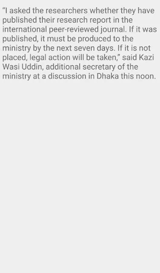 “I asked the researchers whether they have published their research report in the international peer-reviewed journal. If it was published, it must be produced to the ministry by the next seven days. If it is not placed, legal action will be taken,” said Kazi Wasi Uddin, additional secretary of the ministry at a discussion in Dhaka this noon.