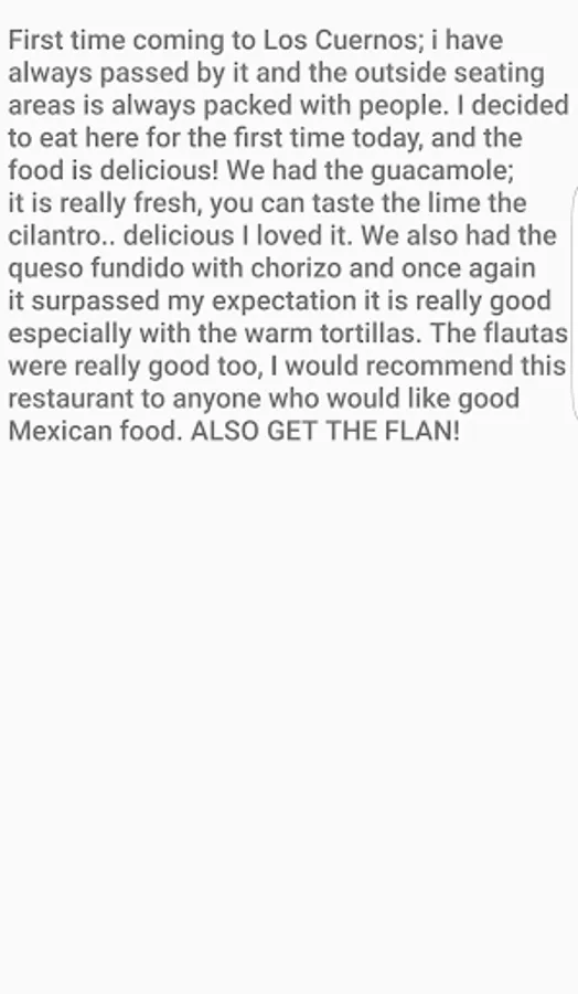 First time coming to Los Cuernos; i have always passed by it and the outside seating areas is always packed with people. I decided to eat here for the first time today, and the food is delicious! We had the guacamole; it is really fresh, you can taste the lime the cilantro.. delicious I loved it. We also had the queso fundido with chorizo and once again it surpassed my expectation it is really good especially with the warm tortillas. The flautas were really good too, I would recommend this restaurant to anyone who would like good Mexican food. ALSO GET THE FLAN!