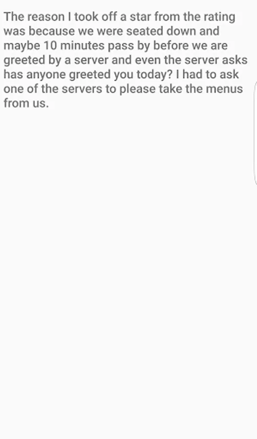 The reason I took off a star from the rating was because we were seated down... and maybe 10 minutes pass by before we are greeted by a server... and even the server asks "has anyone greeted you today?" I had to ask one of the servers to please take the menus from us.