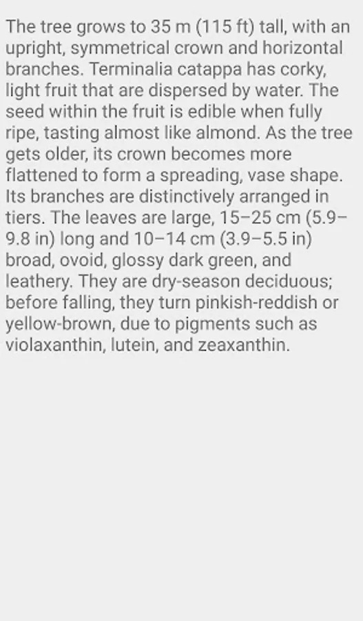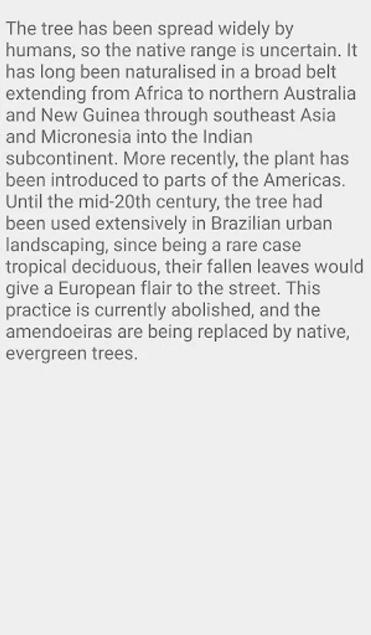 The Indian almond, which is salt tolerant, is widely cultivated and naturalized in several regions of the world. The seeds are dispersed by water and bats. Its root and bark are used for tanning. The kernel is also edible. Compared to the Indian almond, the Madagascar almond has slender branchlets and smaller leaves. Both of them are deciduous in fall and winter.