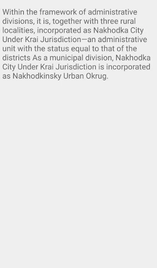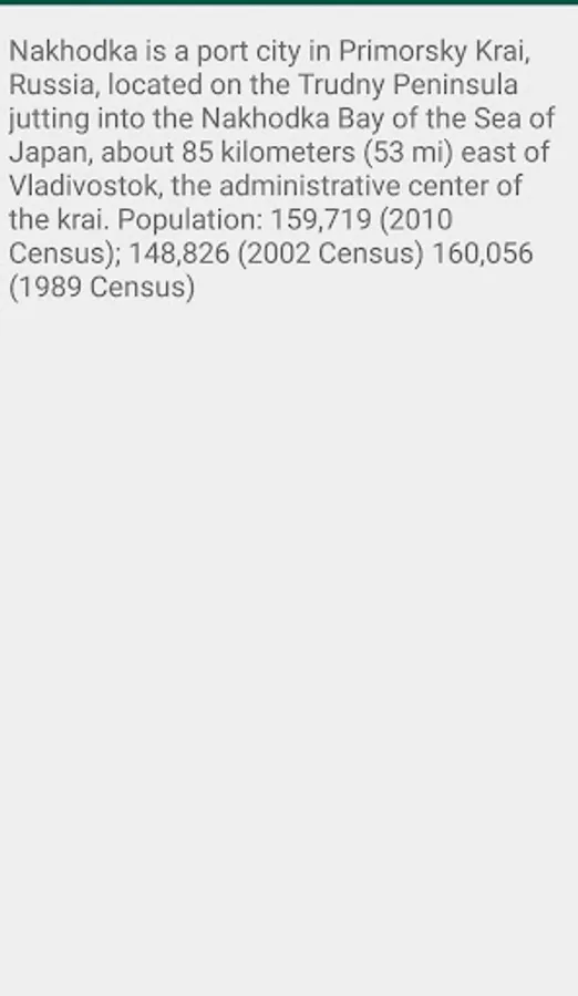 Nakhodka is a port city in Primorsky Krai, Russia, located on the Trudny Peninsula jutting into the Nakhodka Bay of the Sea of Japan, about 85 kilometers (53 mi) east of Vladivostok, the administrative center of the krai. Population: 159,719 (2010 Census); 148,826 (2002 Census);[8] 160,056 (1989 Census).
