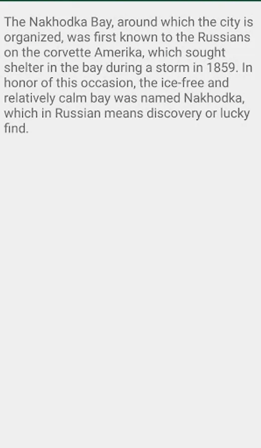 The Nakhodka Bay, around which the city is organized, was first known to the Russians on the corvette Amerika, which sought shelter in the bay during a storm in 1859. In honor of this occasion, the ice-free and relatively calm bay was named Nakhodka, which in Russian means "discovery" or "lucky find".