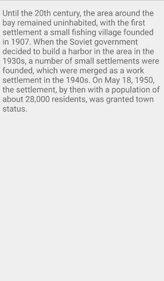 Until the 20th century, the area around the bay remained uninhabited, with the first settlement a small fishing village founded in 1907.[citation needed] When the Soviet government decided to build a harbor in the area in the 1930s, a number of small settlements were founded, which were merged as a work settlement in the 1940s. On May 18, 1950, the settlement, by then with a population of about 28,000 residents, was granted town status