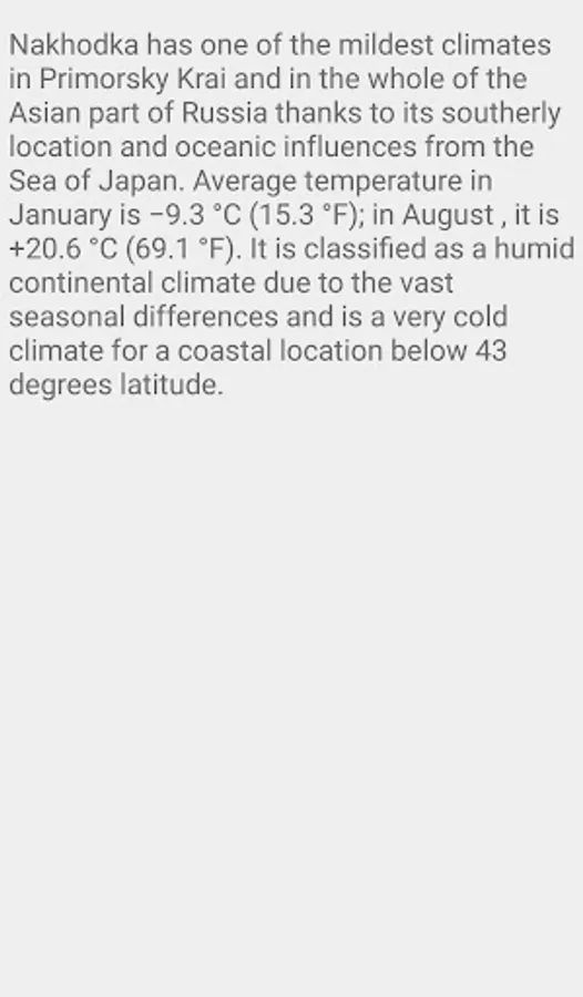 Nakhodka has one of the mildest climates in Primorsky Krai and in the whole of the Asian part of Russia thanks to its southerly location and oceanic influences from the Sea of Japan. Average temperature in January is −9.3 °C (15.3 °F); in August (the warmest month), it is +20.6 °C (69.1 °F). It is classified as a humid continental climate due to the vast seasonal differences and is a very cold climate for a coastal location below 43 degrees latitude. The maritime influence is manifested in low diurnal temperature variationand a vast summer seasonal lag. Due to the influence of the interior, there is a sharp drop in temperatures between October and November. Half of the year has mean temperatures above 10 °C (50 °F), in spite of the warmest month being only moderately warm and the coldest month having quite severe cold, with a very low seasonal lag in winter.