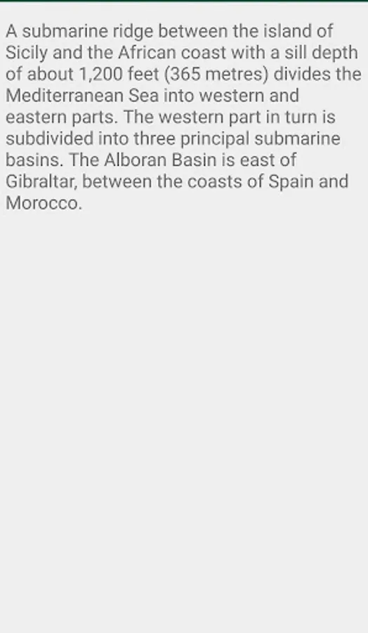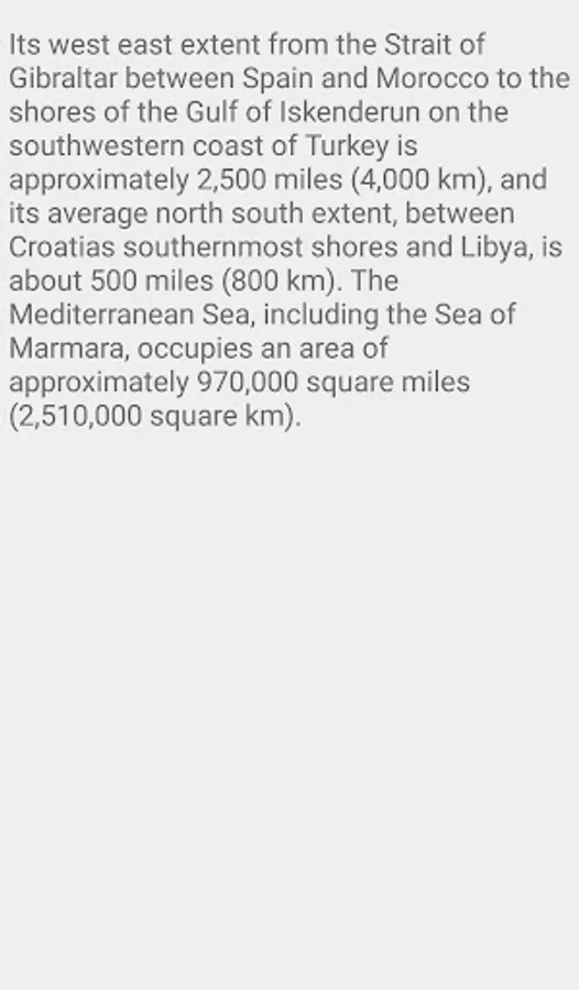 It covers an approximate area of 2.5 million km2 (965,000 sq mi), representing 0.7% of the global ocean surface, but its connection to the Atlantic via the Strait of Gibraltar—the narrow strait that connects the Atlantic Ocean to the Mediterranean Sea and separates Spainin Europe from Morocco in Africa—is only 14 km (8.7 mi) wide. In oceanography, it is sometimes called the Eurafrican Mediterranean Sea or the European Mediterranean Sea to distinguish it from mediterranean seas elsewhere.