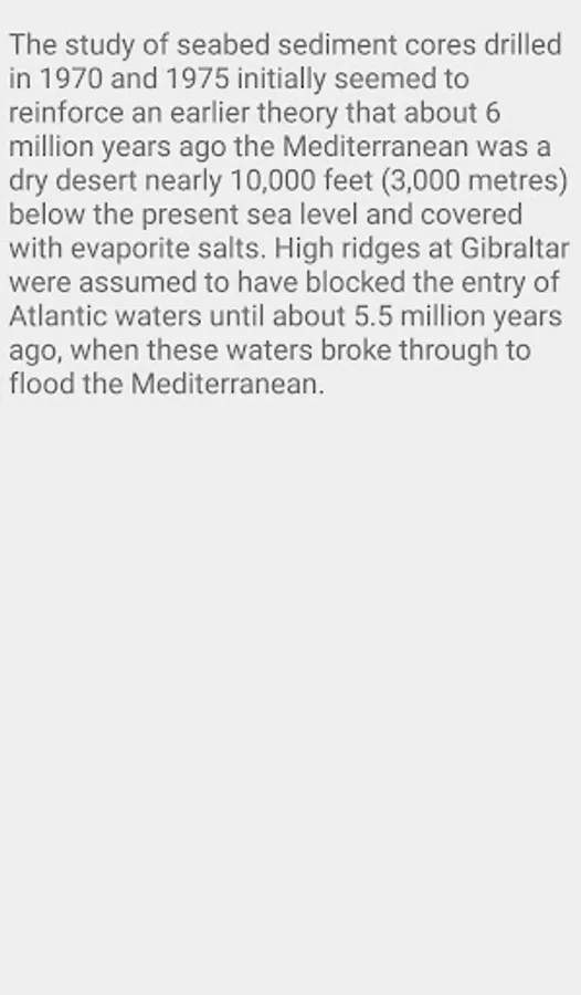 The Mediterranean Sea is a sea connected to the Atlantic Ocean, surrounded by the Mediterranean Basin and almost completely enclosed by land: on the north by Southern Europe and Anatolia, on the south by North Africa and on the east by the Levant. Although the sea is sometimes considered a part of the Atlantic Ocean, it is usually identified[by whom?] as a separate body of water. Geological evidence indicates that around 5.9 million years ago, the Mediterranean was cut off from the Atlantic and was partly or completely desiccated over a period of some 600,000 years, the Messinian salinity crisis, before being refilled by the Zanclean flood about 5.3 million years ago.