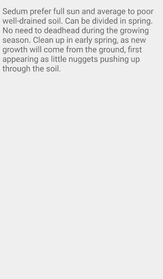Sedum prefer full sun and average to poor well-drained soil. Can be divided in spring. No need to deadhead during the growing season. Clean up in early spring, as new growth will come from the ground, first appearing as little nuggets pushing up through the soil.