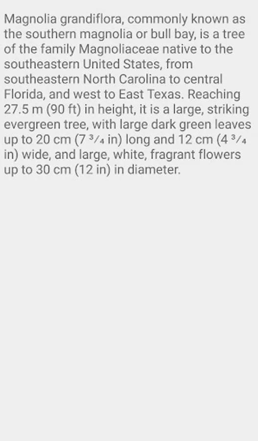 Magnolia grandiflora, commonly known as the southern magnolia or bull bay, is a tree of the family Magnoliaceae native to the southeastern United States, from southeastern North Carolina to central Florida, and west to East Texas. Reaching 27.5 m (90 ft) in height, it is a large, striking evergreen tree, with large dark green leaves up to 20 cm (7 3⁄4 in) long and 12 cm (4 3⁄4 in) wide, and large, white, fragrant flowers up to 30 cm (12 in) in diameter.
