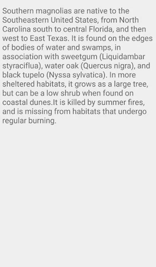 Southern magnolias are native to the Southeastern United States, from North Carolina south to central Florida, and then west to East Texas. It is found on the edges of bodies of water and swamps, in association with sweetgum (Liquidambar styraciflua), water oak (Quercus nigra), and black tupelo (Nyssa sylvatica). In more sheltered habitats, it grows as a large tree, but can be a low shrub when found on coastal dunes.[7] It is killed by summer fires, and is missing from habitats that undergo regular burning.