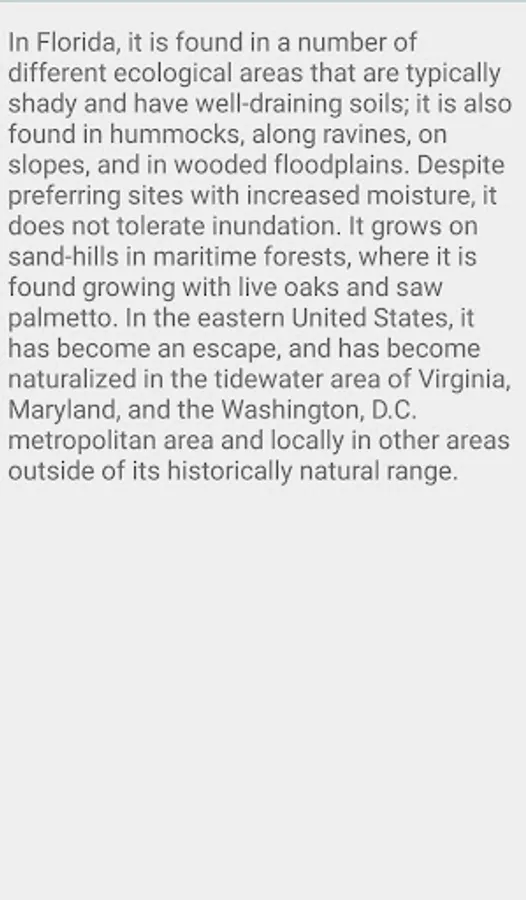 In Florida, it is found in a number of different ecological areas that are typically shady and have well-draining soils; it is also found in hummocks, along ravines, on slopes, and in wooded floodplains. Despite preferring sites with increased moisture, it does not tolerate inundation. It grows on sand-hills in maritime forests, where it is found growing with live oaks and saw palmetto. In the eastern United States, it has become an escapee, and has become naturalized in the tidewater area of Virginia, Maryland, and the Washington, D.C. metropolitan area and locally in other areas outside of its historically natural range.