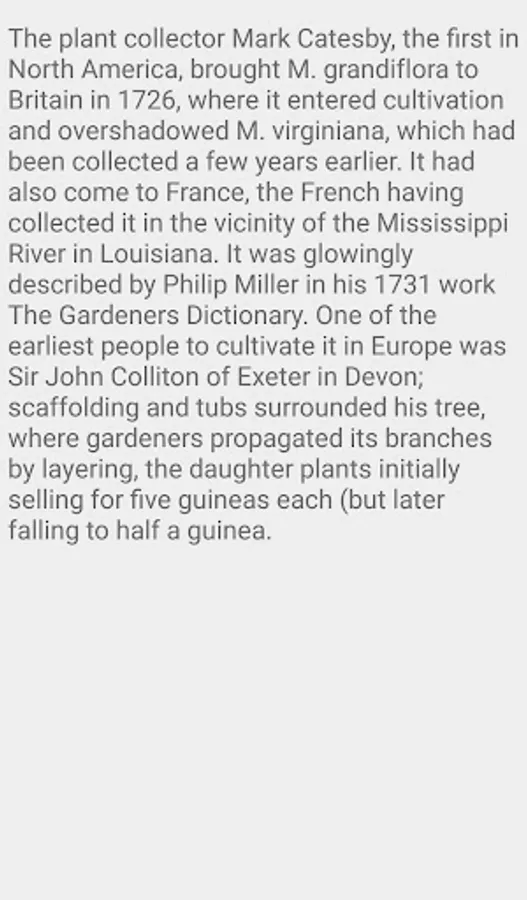 Magnolia grandiflora was one of the many species first described by Linnaeus in the 10th edition of his Systema Naturae in 1759, basing his description on the earlier notes of Miller. He did not select a type specimen. Its specific epithet is derived from the Latin words grandis"big", and flor- "flower".