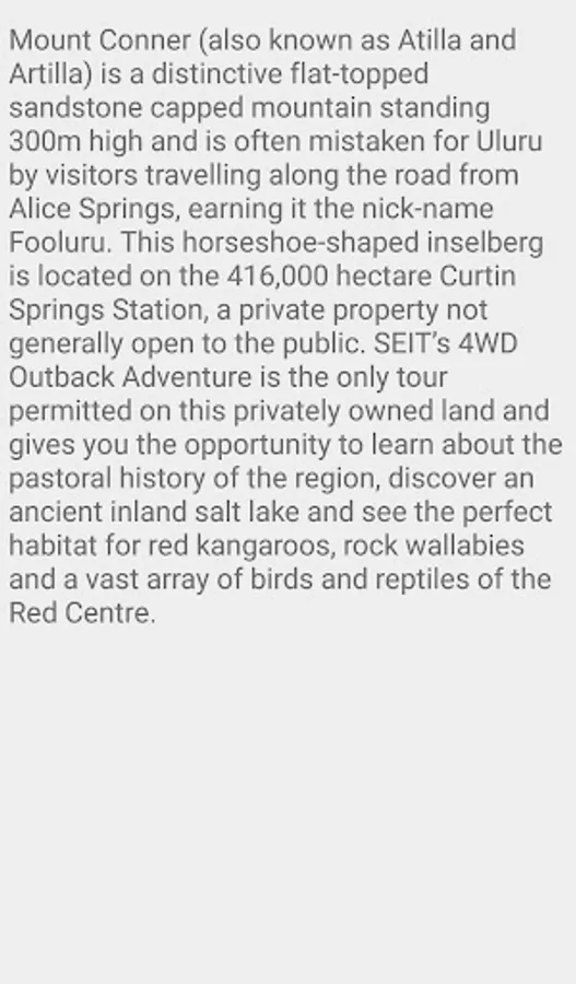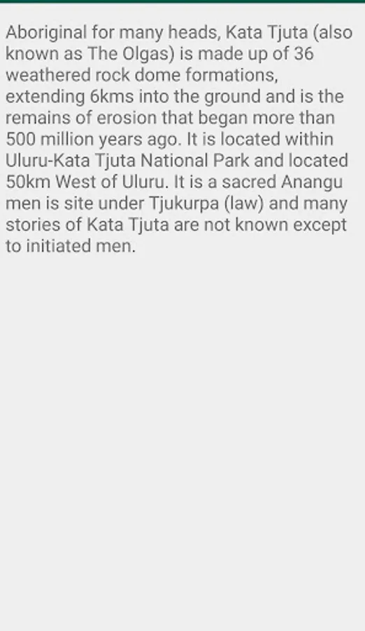 Uluru is sacred to the Pitjantjatjara Anangu, the Aboriginal people of the area. The area around the formation is home to an abundance of springs, waterholes, rock caves and ancient paintings. Uluru is listed as a UNESCO World Heritage Site. Uluru and Kata Tjuta, also known as the Olgas, are the two major features of the Uluṟu-Kata Tjuṯa National Park.