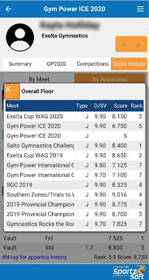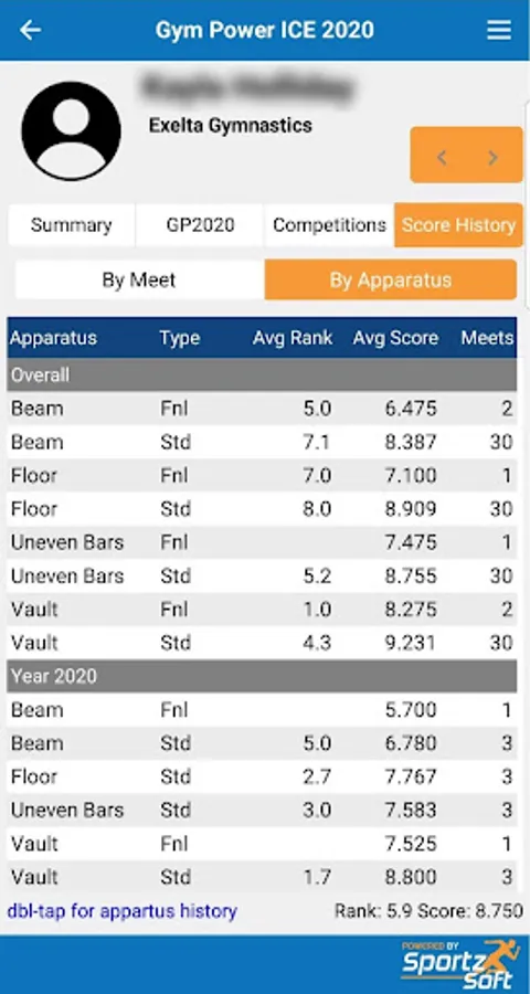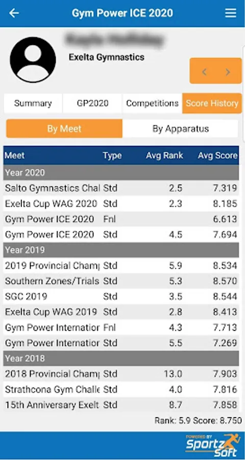 New Athlete page provides athlete photo, current meet assignments, and complete scoring history for all meets current and historical.