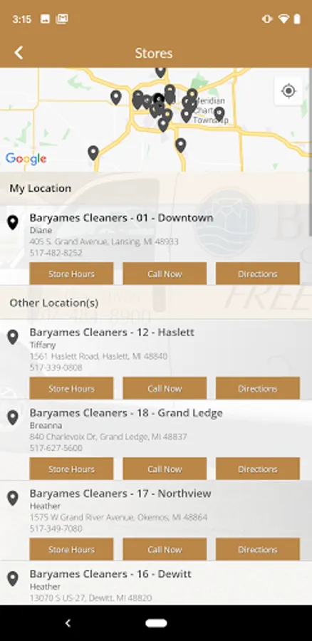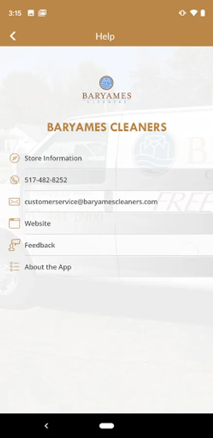 5) Quickly contact Baryames Cleaners by phone or email and access their website all directly from your device.