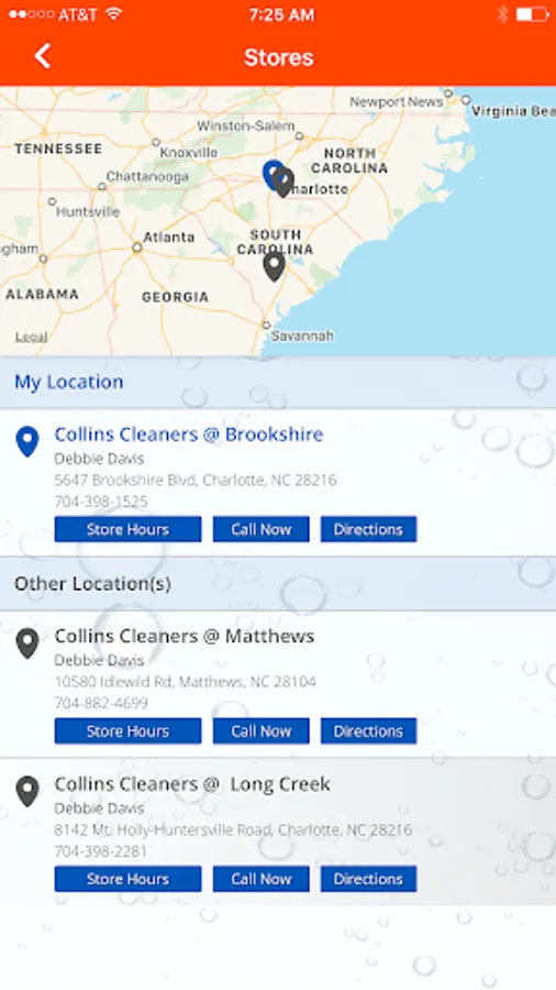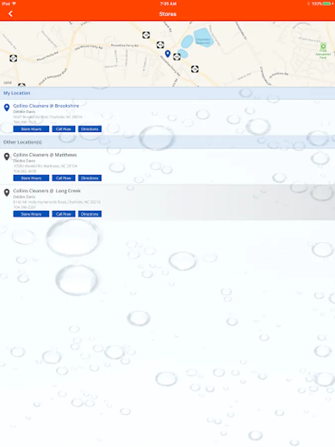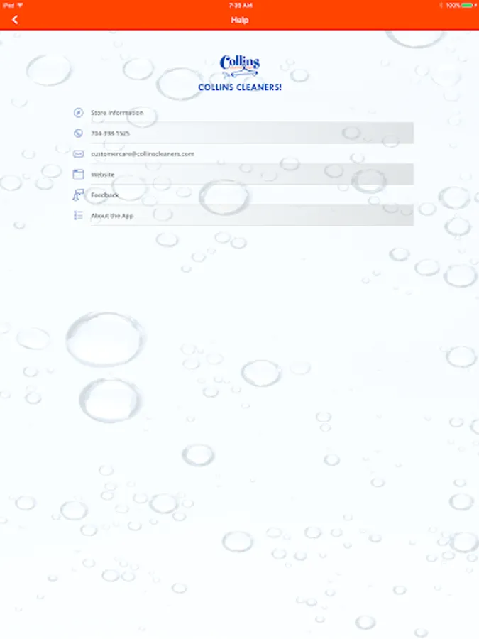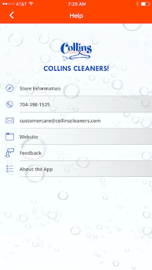 5) Quickly contact Collins Cleaners by phone or email and access their website all directly from your device.