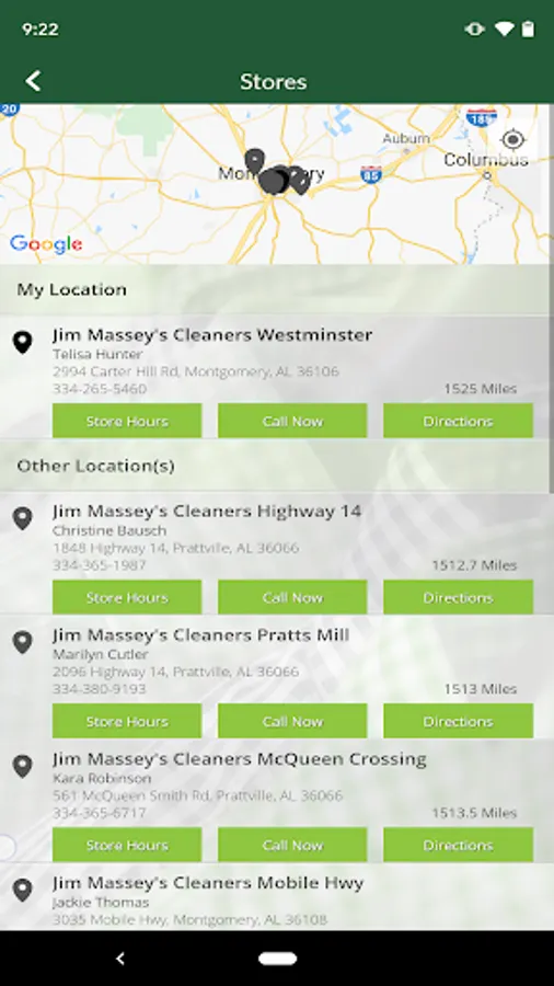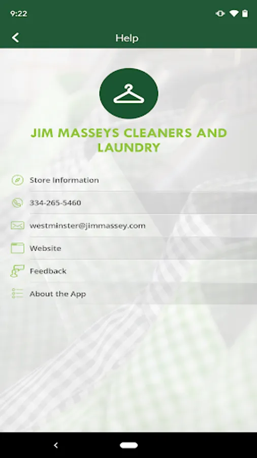 5) Quickly contact Jim Massey Cleaners by phone or email and access their website all directly from your device.