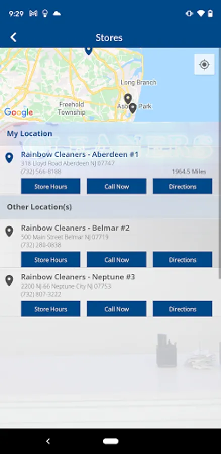 5) Quickly contact Rainbow Cleaners by phone or email and access their website all directly from your device.