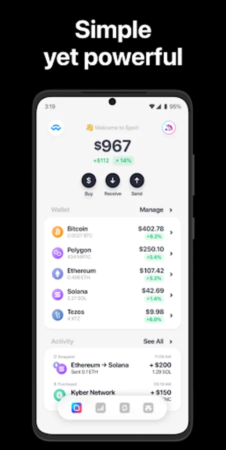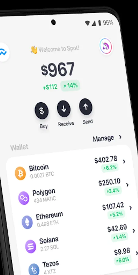 Spot is a state-of-the-art cryptocurrency wallet (non-custodial crypto wallet). Its unprecedented security makes it is the best way to store your cryptocurrencies. And we never own your cryptos: Spot is a decentralized and non-custodial wallet. Other services like Coinbase, Crypto.com, Bitstamp, Gemini, Binance, FTX, PayPal or Kraken hold your cryptos. With Spot, you're free!