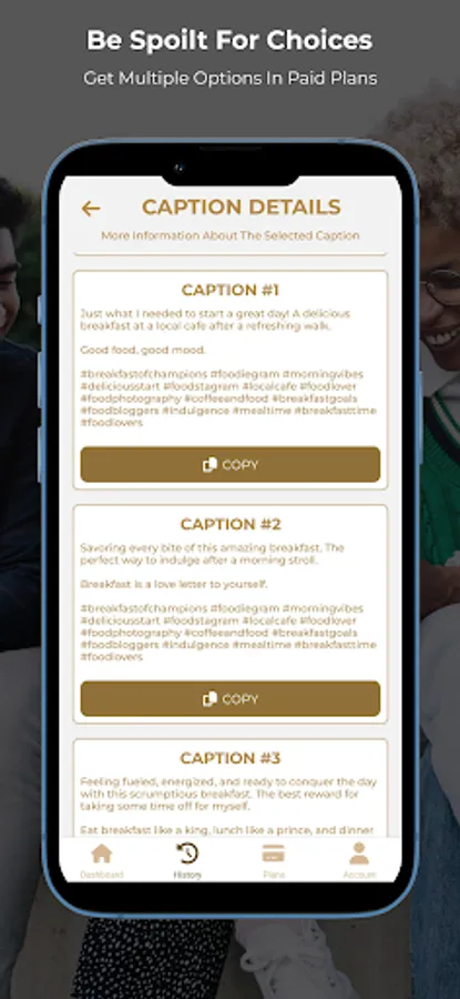 Explore the world of language diversity with SpotBuzz. Generate catchy captions not just in English, but in various languages. Go global with your social media outreach without any language barrier. Upgrade to our premium plans and enjoy the luxury of choice. Get multiple captions for Instagram photos, pick what you like, and ensure your post is nothing short of perfect.